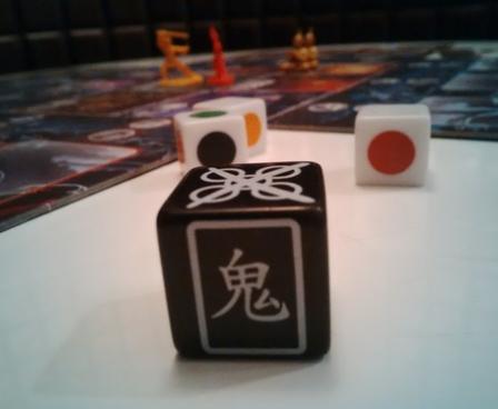 The players, using teamwork, will have to exorcise the ghosts that appear during the course of the game. At the beginning of his turn, a player brings a ghost into play and places it on a free spot, and more than one can come in at the same time. The ghosts all have abilities of their own some affecting the Taoists and their powers, some causing the active player to roll the curse die for a random effect, and others haunting the villager tiles and blocking that tile's special action. On his turn, a Taoist can move on a tile in order to exorcise adjacent ghosts or to benefit from the villager living on the tile, providing it is not haunted. Each tile of the village allows the players to benefit from a different bonus. With the cemetery, for example, Taoists can bring a dead Taoist back to life, while the herbalist allows to recover spent Tao tokens, etc. It will also be possible to get traps or move ghosts or unhaunt other village tiles.