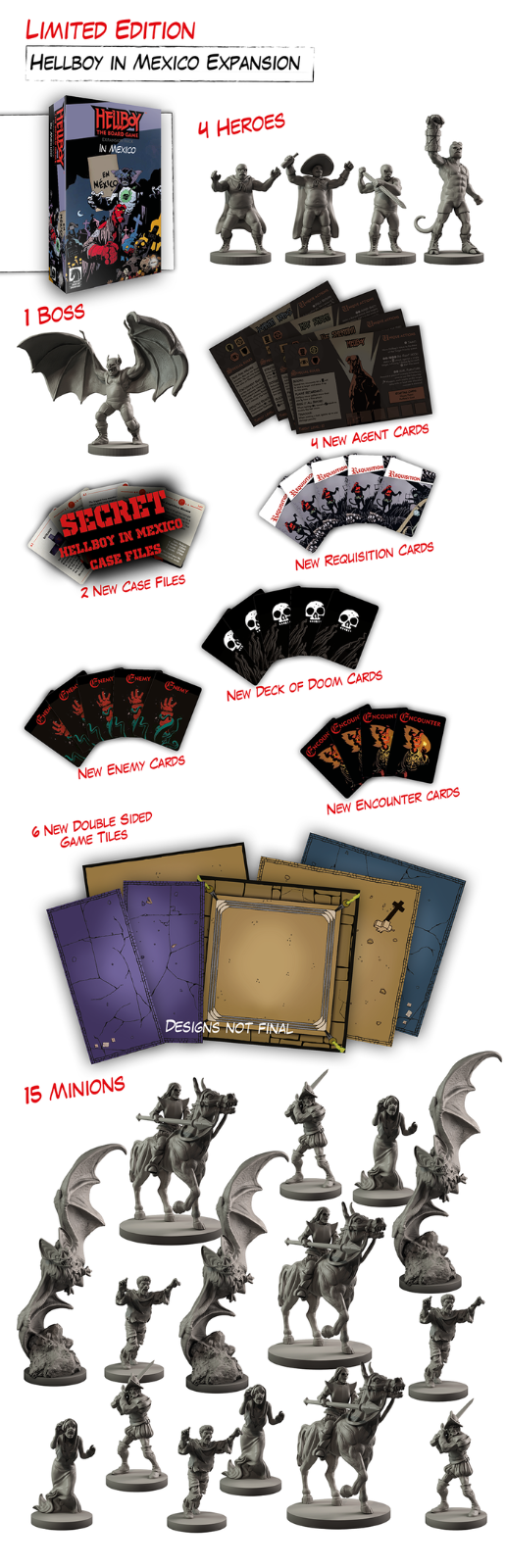Hellboy: The Board Game – In Mexico is an expansion that adds gameplay elements from the "Hellboy in Mexico" storyline to Hellboy: The Board Game. This expansion consists of: