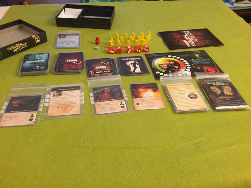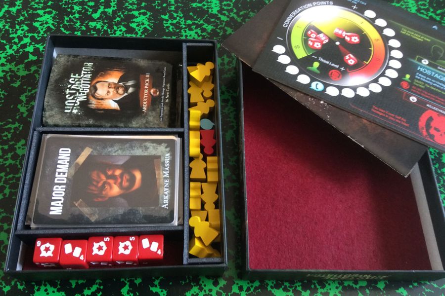 Each turn in the game represents a conversation between you and the hostage taker. You'll play cards and roll dice to increase conversation points, decrease the threat level, and release hostages. Hostage Negotiator uses a unique "hand-building" mechanism that puts cards you purchase directly in your hand for next turn rather than leaving you wondering when the cards will show up like in deck-building games.
