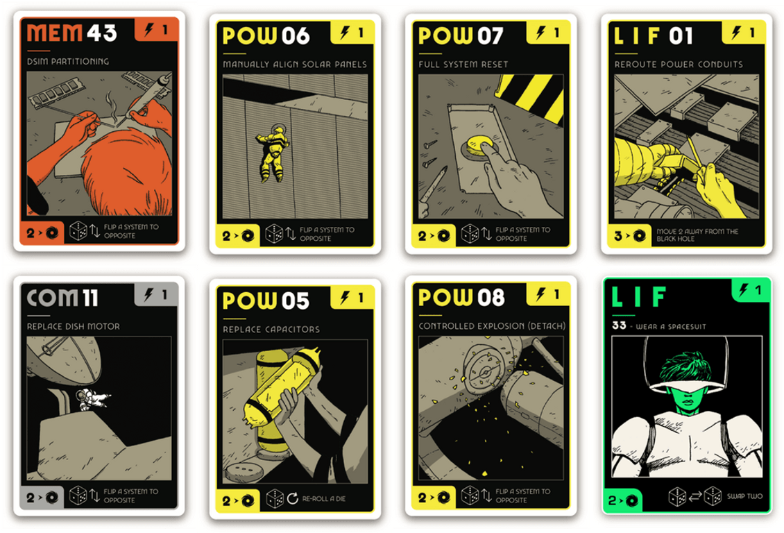 Your challenge in Lux Aeterna is to draw and play all of the cards in the main deck, one turn after another, without the spaceship collapsing completely or falling into the black hole. Cards have multiple functions; you will assign drawn cards to one each of these functions each turn: