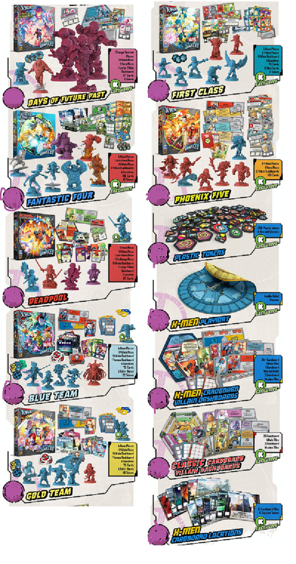 In Marvel United: X-Men, you take the role of iconic Marvel Heroes cooperating to stop the master plan of a powerful Villain controlled by the game. Each Villain unveils their unique master plan, with cards that trigger different effects, and threats that pose challenges across the locations. Heroes must choose carefully the cards to play from their unique decks, that not only offer different actions and superpowers to use, but also combine with the actions of other Heroes to do the impossible. Build your storyline, unite your powers, save the day!