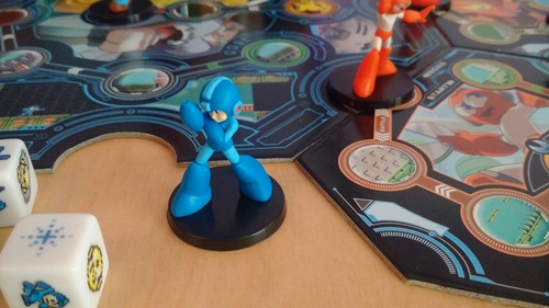 Created for the 25th anniversary of the character, Mega Man: The Board Game is a 2-6 player board game in which players control both their character and Dr. Wily's forces, ideally to impede the progress of other players. After determining who goes first, players choose the Robot Master's stage on which they wish to start the game. On your turn, flip over the challenge card to reveal your first challenge. You choose the dice you wish to use to pass the challenge, then play cards from your hand and use abilities from your character to blast, jump or run through the challenge. Your opponents can play cards from the Dr. Wily side of their hand to make your challenge more difficult, possibly doing damage or taking lives from you along the way. If you beat the challenge, you move forward on the stage a number of spaces determined by the challenge you defeated.