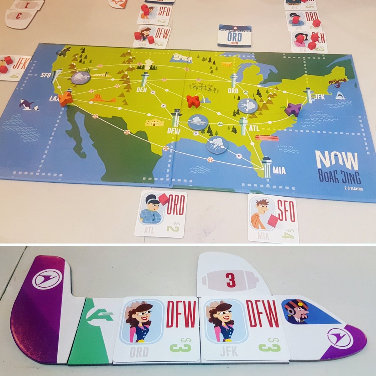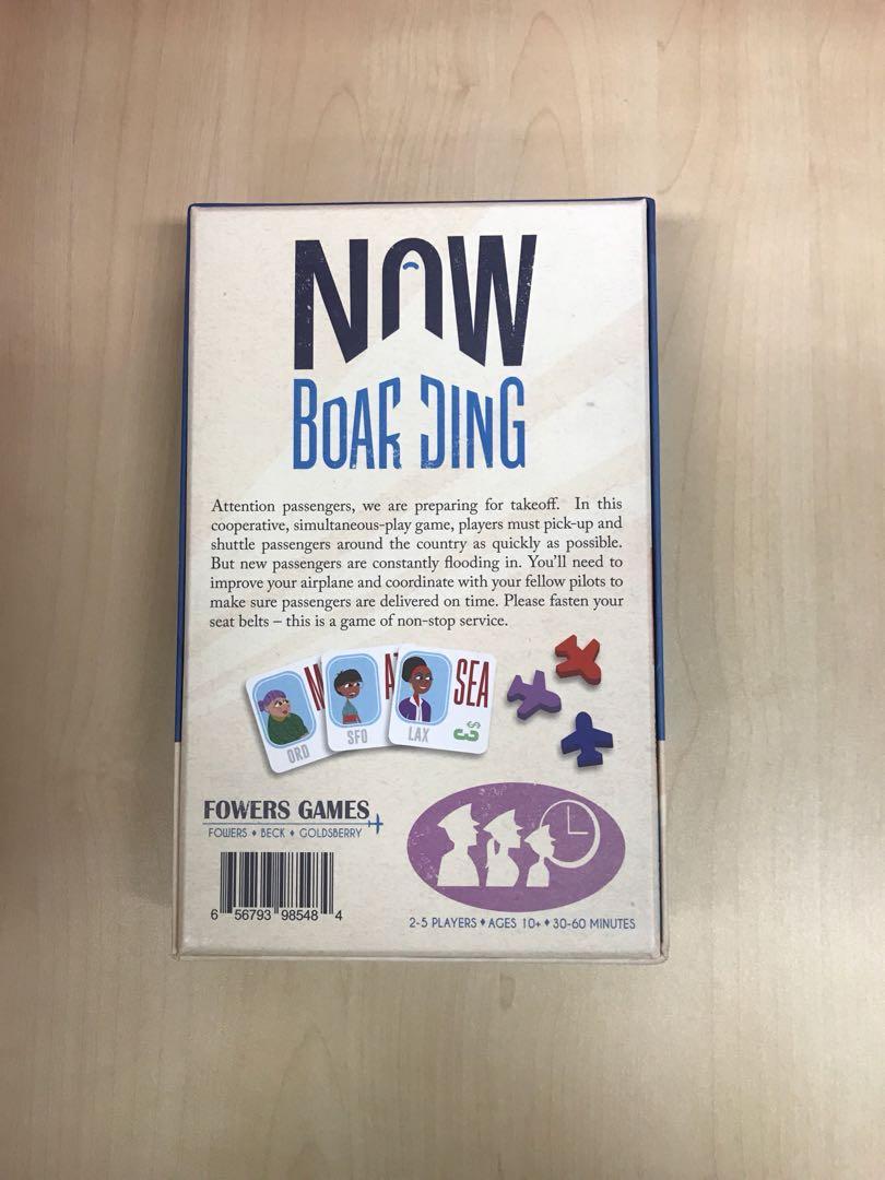 Now Boarding is a real-time cooperative game in which you work together to fly a fleet of airplanes. You must deliver all the passengers to their destinations before they get too angry — and new passengers are constantly arriving! Upgrade your plane to fly faster and carry more passengers to handle the load. The twist: All players take all their turns at the same time! This allows for clever hand-offs of passengers. It's a whole new level of pick-up-and-deliver game.