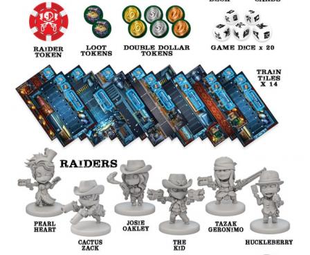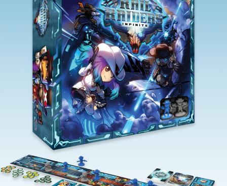 In Rail Raiders Infinite, players assume control of a bandit raiding the Interstellar Express space-rail. Raiders move from car to car searching for loot. The player who gets the biggest haul of double-dollars before the train makes it to the station wins the game. Combat and other actions are determined by rolling a “hand” of five or more custom poker dice. The player who scores the highest hand wins the roll.