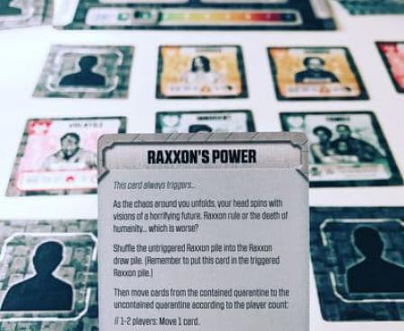 Each round begins by creating a crowd - a grid of citizens from the citizen deck. Players take turns performing one action at a time after resolving any consequences marked on their character sheet. At the start of each turn, a player must resolve all their consequences from previous turns (flip citizens, add citizens, infect citizens, lose evacuated citizens, etc) before performing another action - and adding another consequence. Some consequences require players to draw Raxxon cards. Much like Crossroads cards from Dead of Winter, Raxxon cards feature stories relating to characters in play.