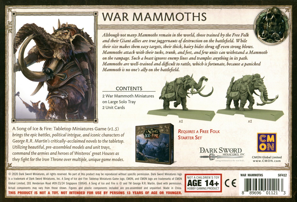Although not many Mammoths remain in the world, those trained by the Free Folk and their Giant allies are true juggernauts of destruction on the battlefield. While their size makes them easy targets, their thick, hairy hides shrug off even strong blows. Mammoths attack with their tusks, trunk, and feet, and few units can withstand a Mammoth on the rampage. Such a beast ignores enemy lines and tramples anything in its path. Mammoths are well-trained and difficult to rattle, which is fortunate, because a panicked Mammoth is one's ally on the battlefield.
