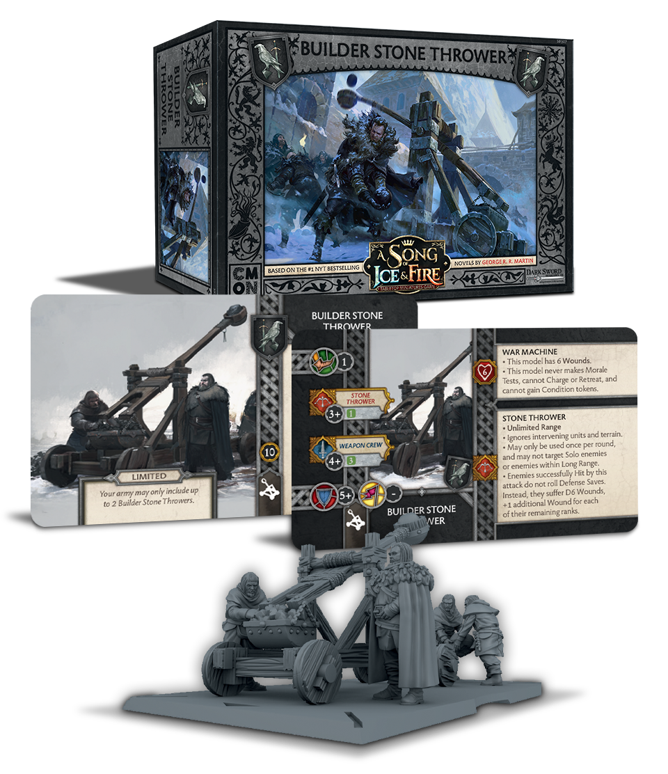It remains a running chuckle amongst the Night's Watch brothers that the Builder Stone Thrower insist that their mobile siege platforms are decidedly not catapults. The Crews maintain that the massive catapults that defend the Wall itself are defined by their varieties of specialized projectiles, earning them the more vaunted name. And yet, when a Stone Thrower sends a hundred-pound boulder rolling through enemy ranks, crushing troops even in the heaviest armor, no one much cares about the distinction. While deadly and powerful, the Stone Thrower is cumbersome to move, and quite vulnerable to enemy cavalry.