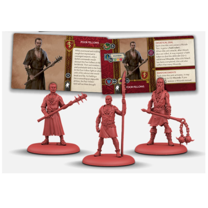 The Poor Fellows Unit Box gives Lannister Commanders a unit full of surprises on the battlefield. Having only moderate combat abilities, their true strength comes from passing Morale tests. That gives them a Faith token that can later be spent to deal direct Wounds to enemies. The unit also continually regenerates its numbers as the battle goes on, calling up new faithful to join their ranks each time they activate. The unit can be on the verge of destruction one turn, then swell back to full combat strength in a couple turns.