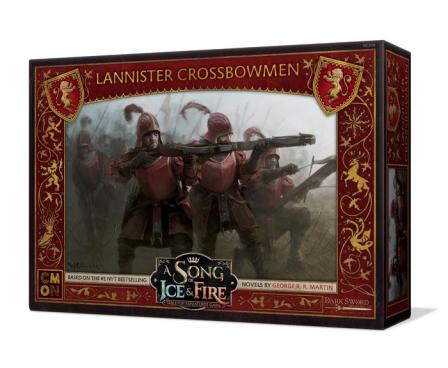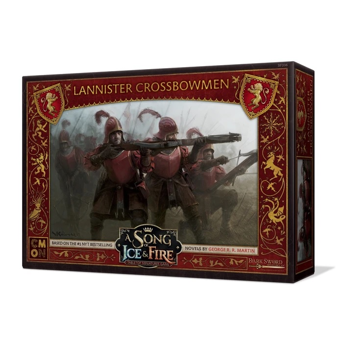 The A Song of Ice & Fire: Tabletop Miniatures Game – Lannister Crossbowmen unit box contains twelve miniature figures in four different sculpts, one unit card, and one movement tray. This unit of deadeye soldiers takes advantage of the technology available to a family of means. At close or long range, their bolts can pierce even thick armor. However, a wise commander will keep them away from melee charges, if possible.