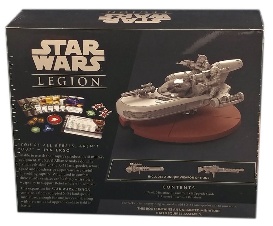 Already a speedy craft thanks to its powerful repulsor engine, an X-34 Landspeeder becomes a threat to even the toughest Imperial opponents when driven by an experienced pilot and equipped with an assortment of weapons. The X-34 Landspeeder Unit Expansion adds one X-34 landspeeder miniature — complete with two unique weapon options — to your Rebel armies. Along with the miniature, you'll also find a unit card and all the tokens you need to get your X-34 up and running as well as an array of upgrade cards to customize it to your specific battle plans.