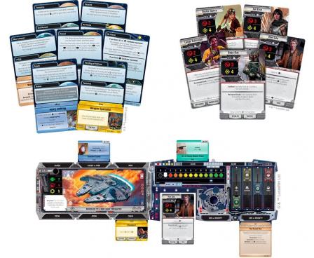 While the path to victory may be different for scoundrels finding their way in the Outer Rim, everyone starts from the bottom with a simple starship. Your player board not only tracks your fame progress, but also contains slots for your ship, your character card, gear, reputation, modifications, jobs, and bounties.