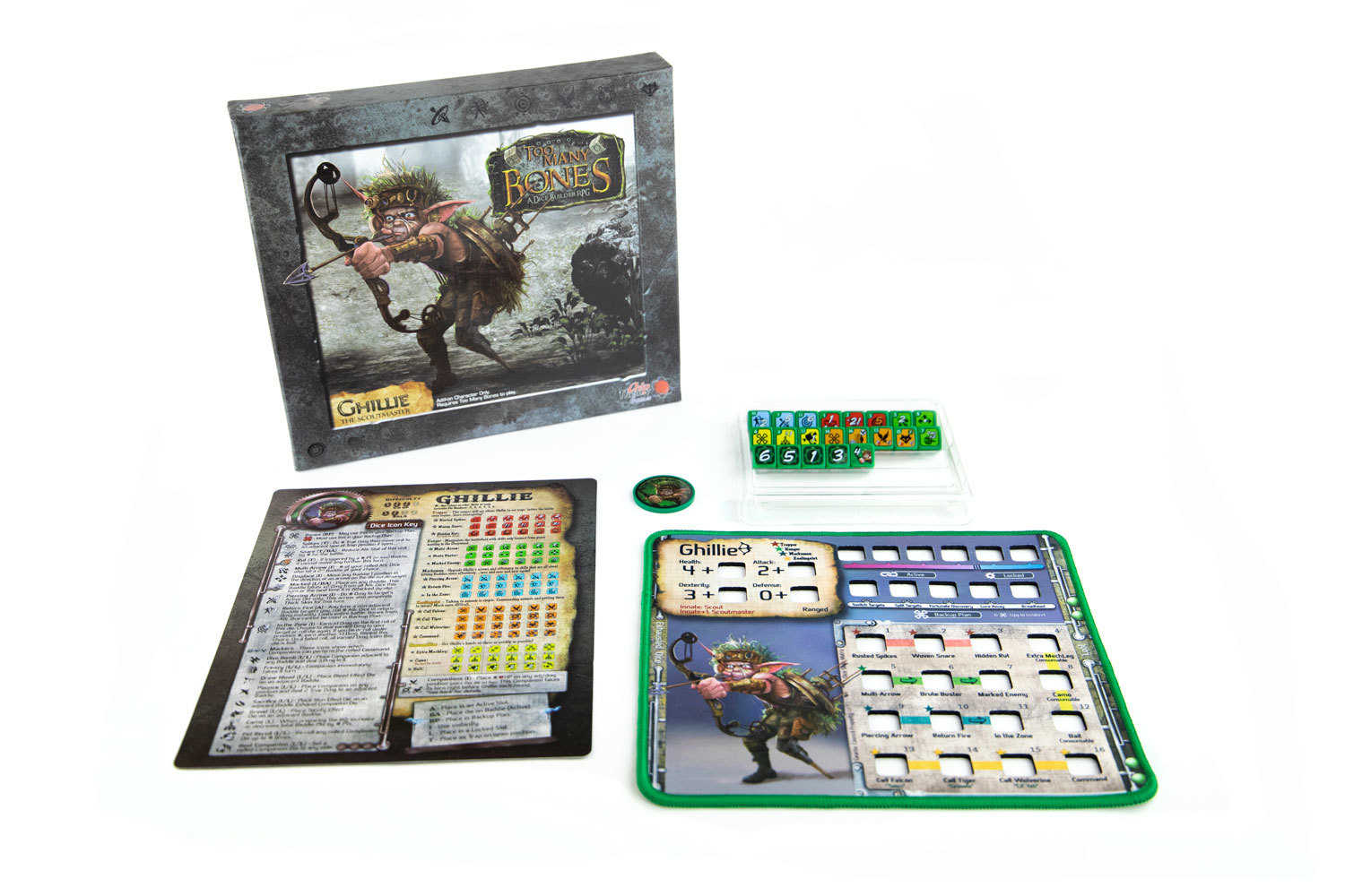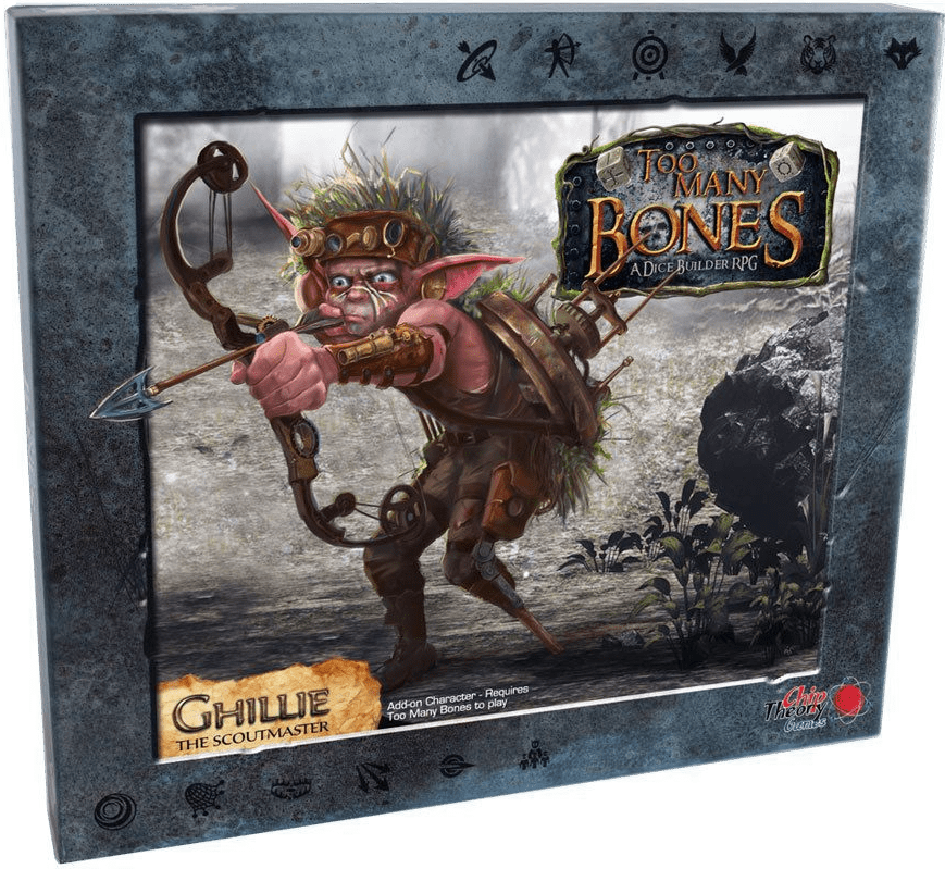 Enhance your Too Many Bones experience by adding Ghillie, the Scoutmaster! Ghillie adds numerous new tactical options to your party. Ensnare The Ebon in clever traps. Summon companions onto the Battle Mat to create havoc for the toughest Baddies. Use ranged attacks for invaluable versatility for both solo and group adventuring.