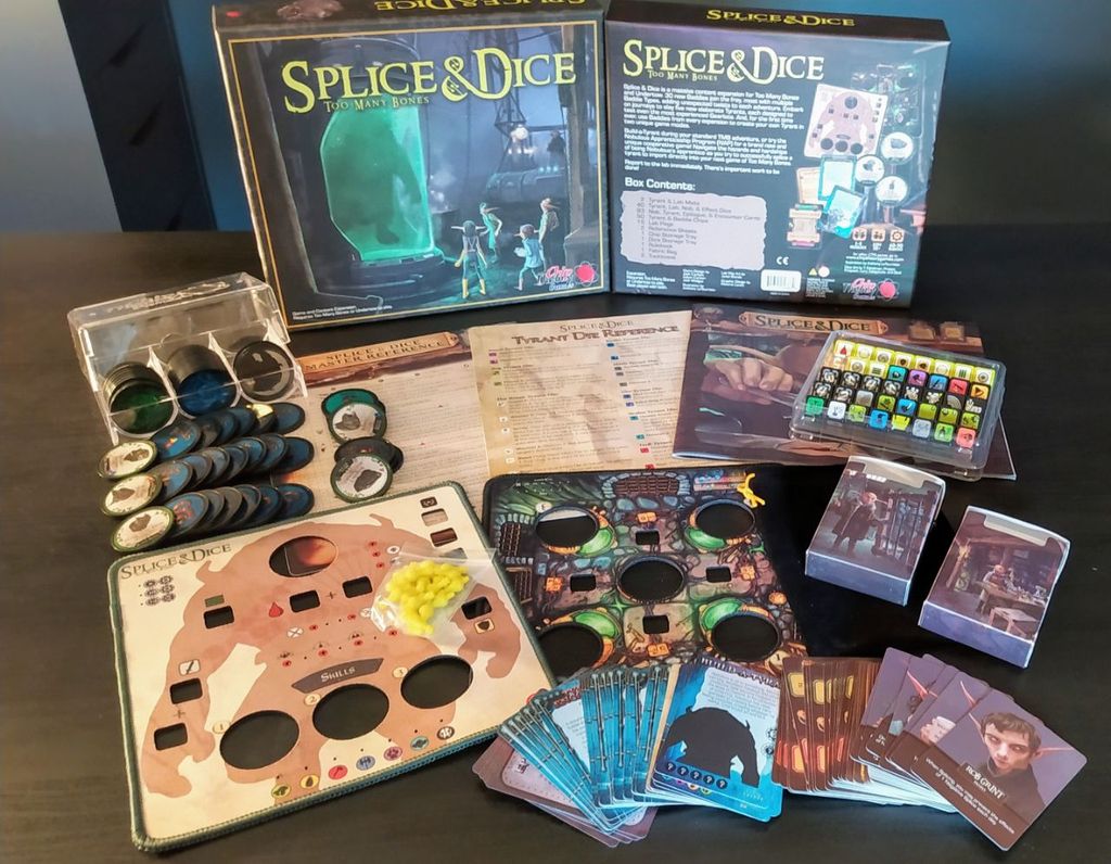 Too Many Bones: Splice & Dice allows players to create their own tyrants using baddies from their Too Many Bones base games and add-ons! Build a tyrant alongside your standard TMB games, or work for Nobulous outside of a TMB game and port your creation in later.