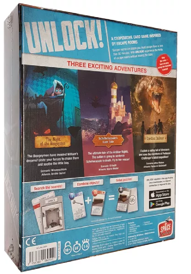 Unlock! is a cooperative card game inspired by escape rooms that uses a simple system which allows you to search scenes, combine objects, and solve riddles. Play Unlock! to embark on great adventures, while seated at a table using only cards and a companion app that can provide clues, check codes, monitor time remaining, etc. The three scenarios are (according to the app):