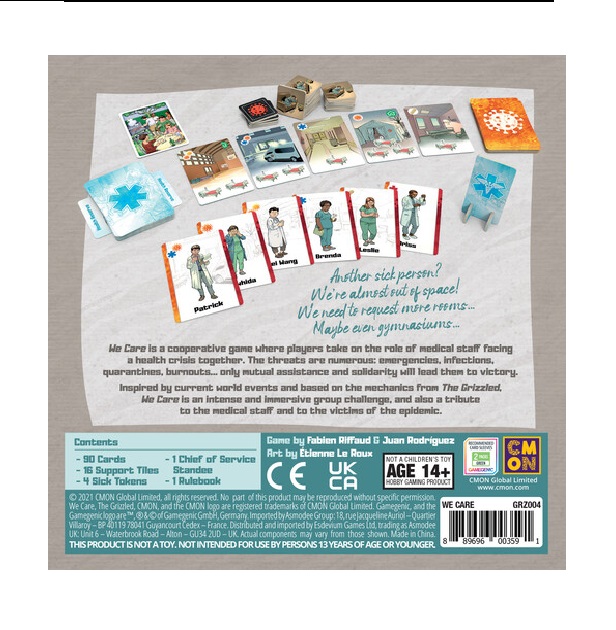 We Care — based on The Grizzled and inspired by current world events — puts players deep in the trenches as healthcare professionals battling a terrible disease. Working together, players must use their limited resources wisely. The stress of the job is a constant worry, as is possibly contracting the illness themselves.